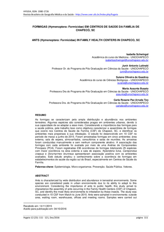 As formigas se caracterizam pela ampla distribuição e abundância nos ambientes terrestres. Algumas espécies são consideradas pragas em ambientes urbanos, devido à sua capacidade de se adaptar a esse meio. Considerando a importância das formigas para a saúde pública, este trabalho teve como objetivos caracterizar a assembleia de formigas que ocorre nos Centros de Saúde da Família (CSF) de Chapecó, SC, e identificar os ambientes mais propensos à sua infestação. O estudo foi desenvolvido em 10 CSF no período de março a junho de 2015. Foram amostradas formigas em cinco ambientes: área externa, sala de espera, almoxarifados, consultórios e salas de reuniões. As amostras foram conduzidas manualmente e sem nenhum componente atrativo. A associação das formigas com cada ambiente foi avaliada por meio de uma Análise de Componentes Principais (PCA).Foram registradas 236 ocorrências de formigas totalizando 25 espécies com maior ocorrência na área externa e sala de espera. Nylanderia fulva, Camponotuscrassus e Dorymyrmexbrunneus apresentaram associação positiva com os ambientes avaliados.Este estudo ampliou o conhecimento sobre a ocorrência de formigas em estabelecimentos de saúde da região sul do Brasil, especialmente em Centros de Saúde da Família.