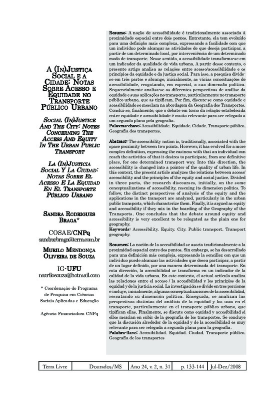 A noção de acessibilidade é tradicionalmente associada à proximidade espacial entre dois pontos. Entretanto, ela tem evoluído para uma definição mais complexa, expressando a facilidade com que um indivíduo pode alcançar as atividades de que deseja participar, a partir de um determinado local, por interveniência de um determinado modo de transporte. Nesse sentido, a acessibilidade transforma-se em um indicador da qualidade de vida urbana. A partir desse contexto, o presente artigo analisa as relações entre acesso/acessibilidade e os princípios da equidade e da justiça social. Para isso, a pesquisa divide se em três partes e abrange, inicialmente, as várias conceituações de acessibilidade, resgatando, em especial, a sua dimensão política. Sequencialmente analisa-se as diferentes perspectivas de análise da equidade e suas aplicações no transporte, particularmente no transporte público urbano, que as tipificam. Por fim, discute-se como equidade e acessibilidade se mesclam na abordagem da Geografia dos Transportes. Conclui-se, finalmente, que o debate em torno da relação estabelecida entre equidade e acessibilidade é muito relevante para ser relegado aum segundo plano pela geografia