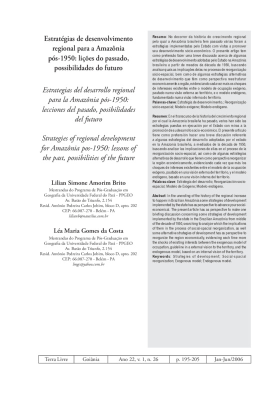 No decorrer da história do crescimento regional pelo qual a Amazônia brasileira tem passado várias foram a estratégias implementadas pelo Estado com vistas a promover seu desenvolvimento sócio-econômico. O presente artigo tem como pretensão fazer uma breve discussão acerca de algumas estratégias de desenvolvimento adotadas pelo Estado na Amazônia brasileira a partir de meados da década de 1950, buscando analisar quais as implicações delas no processo de reorganização sócio-espacial, bem como de algumas estratégias alternativas de desenvolvimento que têm como perspectiva reestruturar economicamente a região, evidenciando cada vez mais os choques de interesses existentes entre o modelo de ocupação exógeno, pautado numa visão externa ao território, e o modelo endógeno, fundamentado numa visão interna do território.