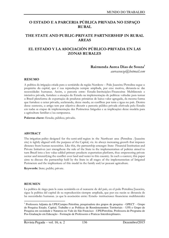 A política da irrigação criada para o semiárido da região Nordeste – Polo Juazeiro/Petrolina segue o propósito do capital, que é sua reprodução sempre ampliada, por esse motivo, distancia-se das necessidades humanas. Assim, a parceria entre: Estado-Instituições-Financeiras Multilaterais e iniciativa privada, fortalece a atuação do Estado na implementação de políticas voltadas para tornar o Brasil plataforma de exportação de produtos primários de baixo valor agregado, da mesma forma que fortalece o setor privado, acelerando, desse modo, os conflitos por terra e água no país. Dentro desse contexto, o artigo tem por objetivo discutir a parceria pública privada efetivada pelo Estado em todas as etapas de implementação dos Perímetros Irrigados e as implicações desse modelo para a agricultura familiar e/ou camponesa.
