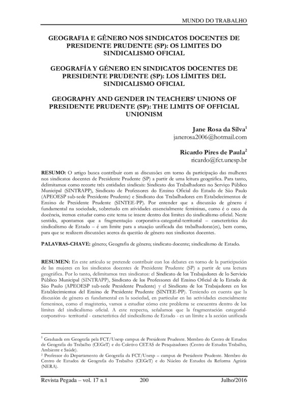 O artigo busca contribuir com as discussões entorno da participação das mulheres nos sindicatos docentes de Presidente Prudente (SP) a partir de uma leitura geográfica. Para tanto, delimitamos como recorte três entidades sindicais: Sindicato dos Trabalhadores no Serviço Público Municipal (SINTRAPP), Sindicato de Professores do Ensino Oficial do Estado de São Paulo (APEOESP sub-sede Presidente Prudente) e Sindicato dos Trabalhadores em Estabelecimentos de Ensino de Presidente Prudente (SINTEE-PP). Por entender que a discussão de gênero é fundamental na sociedade, sobretudo em atividades essencialmente femininas, como é o caso da docência, iremos estudar como este tema se insere dentro dos limites do sindicalismo oficial. Neste sentido, apontamos que a fragmentação corporativa-categorial-territorial – característica do sindicalismo de Estado – é um limite para a atuação unificada das trabalhadoras(es), bem como, para que se realizem discussões acerca da questão de gênero nos sindicatos docentes.