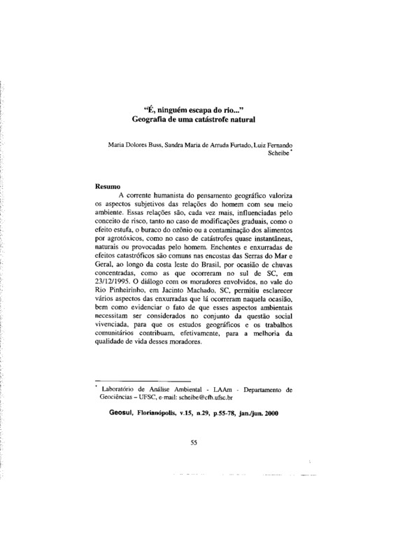 A corrente humanista do pensamento geográfico valorizaos aspectos subjetivos das relações do homem com seu meioambiente. Essas relações são, cada vez mais, influenciadas pelo conceito de risco, tanto no caso de modificações graduais, como o efeito estufa, o buraco do ozônio ou a contaminação dos alimentos por agrotóxicos, como no caso de catástrofes quase instantâneas, naturais ou provocadas pelo homem. Enchentes e enxurradas de efeitos catastróficos são comuns nas encostas das Serras do Mar e Geral, ao longo da costa leste do Brasil, por ocasião de chuvas concentradas, como as que ocorreram no sul de SC, em 23/12/1995. 0 diálogo com os moradores envolvidos, no vale do Rio Pinheirinho, em Jacinto Machado, SC, permitiu esclarecer vários aspectos das enxurradas que lá ocorreram naquela ocasião,bem como evidenciar o fato de que esses aspectos ambientaisnecessitam ser considerados no conjunto da questão socialvivenciada, para que os estudos geográficos e os trabalhoscomunitários contribuam, efetivamente, para a melhoria daqualidade de vida desses moradores.
