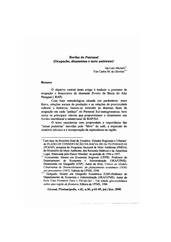 O objetivo central deste artigo e traduzir o processo de ocupação e dinamismo da chamada Bordas da Bacia do Alto Paraguai (BAP). Com base metodológica situada nos parâmetros: meio físico, relações sociais de produção e as relações de proximidade cultural e historica, buscou-se entender as distintas fuses da ocupação em cada "pedaço" do Pantanal Sul-matogrossense, bem como os principais vetores que proporcionam o dinamismo nas bordas meridional e setentrional da BAP/Sul. O texto caracteriza com propriedade a importância das "zonas pioneiras" movidas pela "febre" do café, a expansão do criatório zebuíno e a incorporação da sojeicultura na região. Por fim, considerando a rapidez da ocupação territorial tomou-se necessário a análise das consequências mais visíveis deste processo no meio ambiente pantaneiro.