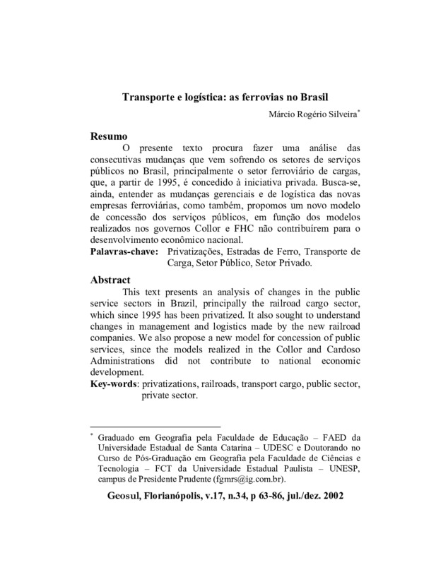 O presente texto procura fazer uma análise das consecutivas mudanças que vem sofrendo os setores de serviços públicos no Brasil, principalmente o setor ferroviário de cargas, que, a partir de 1995, é concedido à iniciativa privada. Busca-se, ainda, entender as mudanças gerenciais e de logística das novas empresas ferroviárias, como também, propomos um novo modelo de concessão dos serviços públicos, em função dos modelos realizados nos governos Collor e FHC não contribuírem para o desenvolvimento econômico nacional.