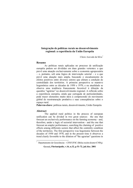 As políticas rurais aplicadas no processo de unificaçãoeuropéia podem ser divididas em duas grandes vertentes: a que prevê uma atuação exclusivamente sobre a economia agropecuária – e, portanto, sob uma lógica de intervenção setorial – e a que prevê uma atuação mais ampla, buscando o encadeamento de efeitos positivos entre diversos setores que afetam a condição de centralidade dos territórios. A primeira perspectiva se manteve hegemônica entre as décadas de 1950 e 1970, e na atualidade se observa uma tendência francamente favorável à diluição da questões “agrárias” no desenvolvimento regional. A reflexão sobre a experiência européia, ainda que carregada de particularidades, pode trazer elementos muito úteis à compreensão do movimentoglobal de reestruturação produtiva e suas conseqüências sobre o espaço rural.
