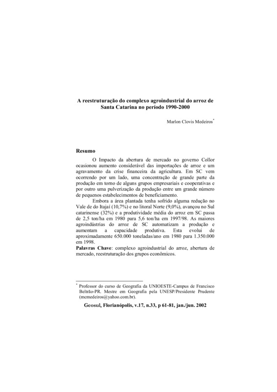 A reestruturação do complexo agroindustrial do arroz de Santa Catarina no período 1990-2000