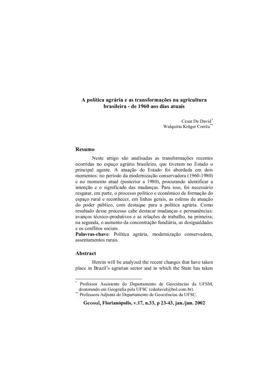 Neste artigo são analisadas as transformações recentesocorridas no espaço agrário brasileiro, que tiveram no Estado oprincipal agente. A atuação do Estado foi abordada em doismomentos: no período da modernização conservadora (1960-1980) e no momento atual (posterior a 1980), procurando identificar a intenção e o significado das mudanças. Para isso, foi necessário resgatar, em parte, o processo político e econômico de formação do espaço rural e reconhecer, em linhas gerais, as esferas de atuação do poder público, com destaque para a política agrária. Como resultado desse processo cabe destacar mudanças e permanências: avanços técnico-produtivos e as relações de trabalho, na primeira; na segunda, o aumento da concentração fundiária, as desigualdades e os conflitos sociais.