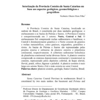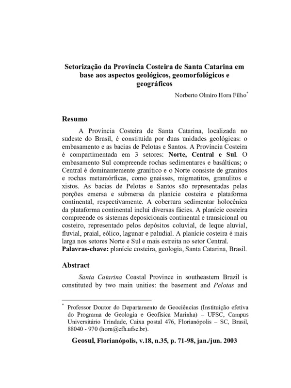 A Província Costeira de Santa Catarina, localizada no sudeste do Brasil, é constituída por duas unidades geológicas: o embasamento e as bacias de Pelotas e Santos. A Província Costeira é compartimentada em 3 setores: Norte, Central e Sul. O embasamento Sul compreende rochas sedimentares e basálticas; o Central é dominantemente granítico e o Norte consiste de granitos e rochas metamórficas, como gnaisses, migmatitos, granulitos e xistos. As bacias de Pelotas e Santos são representadas pelas porções emersa e submersa da planície costeira e plataforma continental, respectivamente. A cobertura sedimentar holocênica da plataforma continental inclui diversas fácies. A planície costeira compreende os sistemas deposicionais continental e transicional ou costeiro, representado pelos depósitos coluvial, de leque aluvial, fluvial, praial, eólico, lagunar e paludial. A planície costeira é mais larga nos setores Norte e Sul e mais estreita no setor Central.