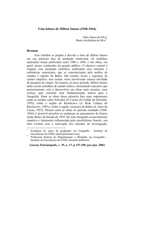 Este trabalho se propõe a discutir a obra de Milton Santos em sua primeira fase de produção intelectual. Os trabalhos analisados foram publicados entre 1948 e 1964, e são obras, em geral, pouco conhecidas do grande público. O objetivo central é resgatar essa produção científica, analisando seus métodos e referências conceituais, que se caracterizaram pela análise de cidades e regiões da Bahia. São estudos locais e regionais de caráter empírico, mas muitas vezes envolvendo intensa atividade de pesquisa de campo. No entanto, já nesse período, Milton Santos tinha escrito trabalhos de caráter teórico, formulando conceitos que posteriormente veio a desenvolver em obras mais recentes, num esforço para construir uma fundamentação teórica para a Geografia. Entre as obras dessa primeira fase mais importantes estão os estudos sobre Salvador (O Centro da Cidade do Salvador, 1959), sobre a região do Recôncavo (A Rede Urbana do Recôncavo, 1959) e sobre a região cacaueira da Bahia (A Zona do Cacau, 1955). Mesmo entre as obras do período estudado (1948-1964), é possível perceber as mudanças no pensamento de Santos ainda dentro da década de 1950. De uma Geografia essencialmente empírica e fortemente influenciada pelo possibilismo francês, sua obra evoluiu com a renovação dos métodos de investigação, porém, ainda com influência francesa de autores como Monbeig, Rochefort, George e Tricart, e passou a apresentar um sensível aperfeiçoamento conceitual.
