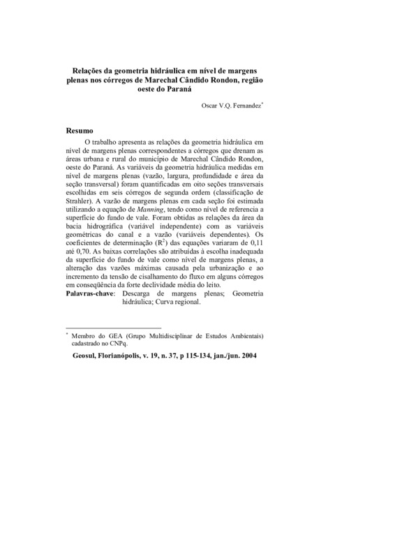 O trabalho apresenta as relações da geometria hidráulica em nível de margens plenas correspondentes a córregos que drenam as áreas urbana e rural do município de Marechal Cândido Rondon, oeste do Paraná. As variáveis da geometria hidráulica medidas em nível de margens plenas (vazão, largura, profundidade e área da seção transversal) foram quantificadas em oito seções transversais escolhidas em seis córregos de segunda ordem (classificação de Strahler). A vazão de margens plenas em cada seção foi estimada utilizando a equação de Manning, tendo como nível de referencia a superfície do fundo de vale. Foram obtidas as relações da área da bacia hidrográfica (variável independente) com as variáveis geométricas do canal e a vazão (variáveis dependentes). Os coeficientes de determinação (R2) das equações variaram de 0,11 até 0,70. As baixas correlações são atribuídas à escolha inadequada da superfície do fundo de vale como nível de margens plenas, a alteração das vazões máximas causada pela urbanização e ao incremento da tensão de cisalhamento do fluxo em alguns córregos em conseqüência da forte declividade média do leito.