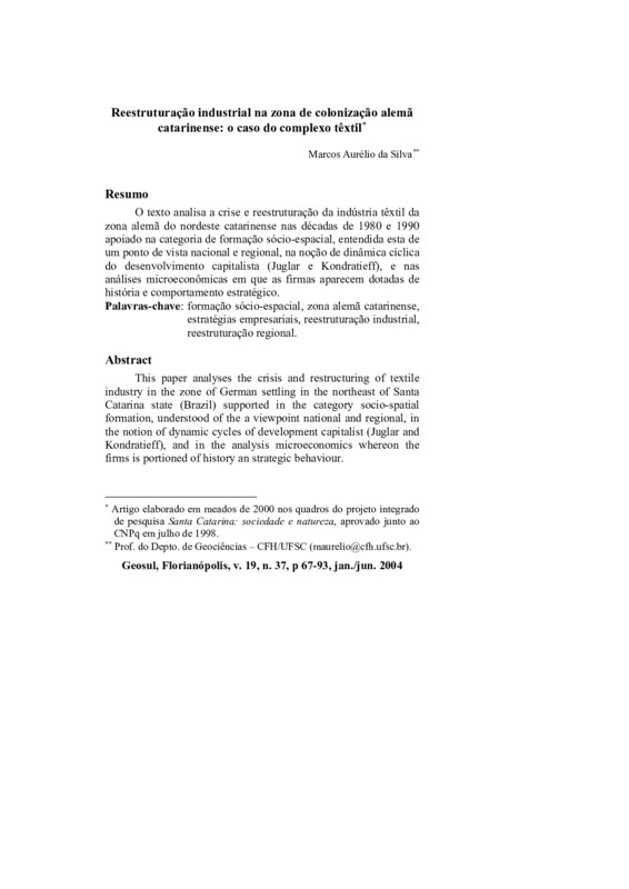 O texto analisa a crise e reestruturação da indústria têxtil da zona alemã do nordeste catarinense nas décadas de 1980 e 1990 apoiado na categoria de formação sócio-espacial, entendida esta de um ponto de vista nacional e regional, na noção de dinâmica cíclica do desenvolvimento capitalista (Juglar e Kondratieff), e nas análises microeconômicas em que as firmas aparecem dotadas de história e comportamento estratégico.