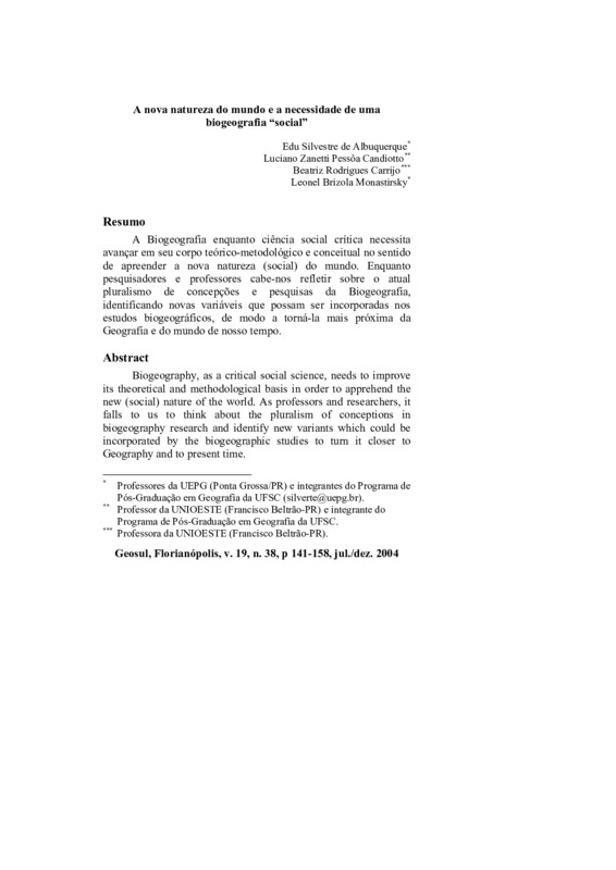 A Biogeografia enquanto ciência social crítica necessita avançar em seu corpo teórico-metodológico e conceitual no sentido de apreender a nova natureza (social) do mundo. Enquanto pesquisadores e professores cabe-nos refletir sobre o atual pluralismo de concepções e pesquisas da Biogeografia, identificando novas variáveis que possam ser incorporadas nos estudos biogeográficos, de modo a torná-la mais próxima da Geografia e do mundo de nosso tempo.