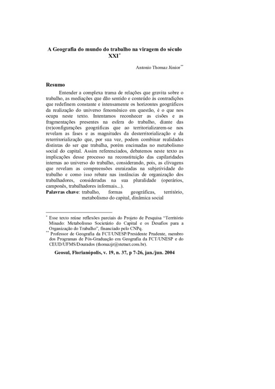 Entender a complexa trama de relações que gravita sobre o trabalho, as mediações que dão sentido e conteúdo às contradições que redefinem constante e intensamente os horizontes geográficos da realização do universo fenomênico em questão, é o que nos ocupa neste texto. Intentamos reconhecer as cisões e as fragmentações presentes na esfera do trabalho, diante das (re)configurações geográficas que ao territorializarem-se nos revelam as fases e as magnitudes da desterritorialização e da reterritorialização que, por sua vez, podem combinar realidades distintas do ser que trabalha, porém encimadas no metabolismo social do capital. Assim referenciados, debatemos neste texto as implicações desse processo na reconstituição das capilaridades internas ao universo do trabalho, considerando, pois, as clivagens que revelam as compreensões enraizadas na subjetividade do trabalho e como isso rebate nas instâncias de organização dos trabalhadores, consideradas na sua pluralidade (operários, camponês, trabalhadores informais...).