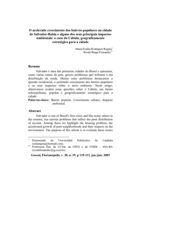 Salvador é uma das primeiras cidades do Brasil e apresenta, como várias outras do país, graves problemas que refletem a má distribuição de renda. Dentre estes problemas destacamos a questão residencial, o acelerado crescimento dos bairros populares e os seus impactos sobre o meio ambiente. Neste artigo, objetivamos avaliar estas questões sobre o Cabula, um bairro soteropolitano, popular e geograficamente estratégico para a cidade.