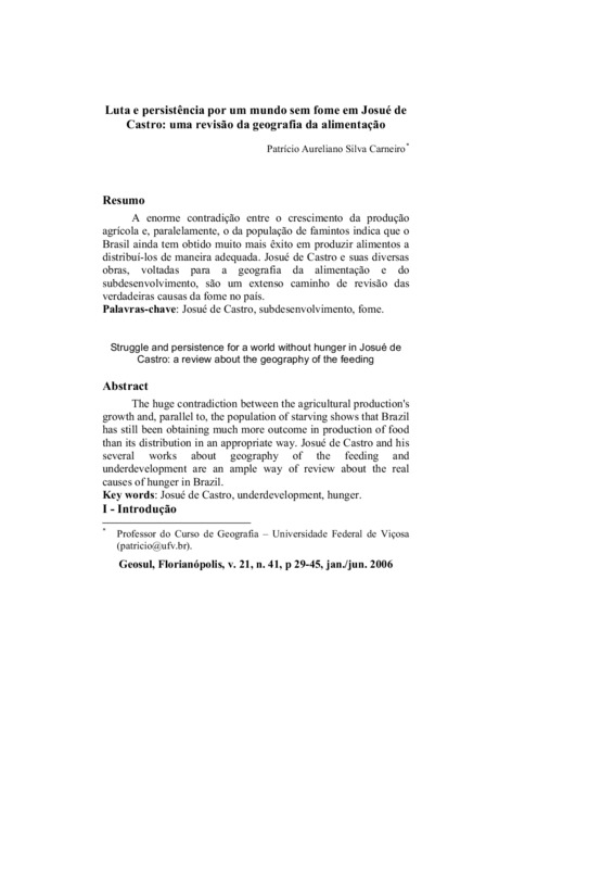 A enorme contradição entre o crescimento da produçãoagrícola e, paralelamente, o da população de famintos indica que o Brasil ainda tem obtido muito mais êxito em produzir alimentos a distribuí-los de maneira adequada. Josué de Castro e suas diversas obras, voltadas para a geografia da alimentação e dosubdesenvolvimento, são um extenso caminho de revisão dasverdadeiras causas da fome no país.