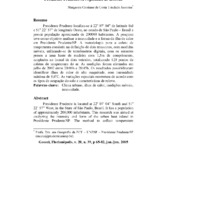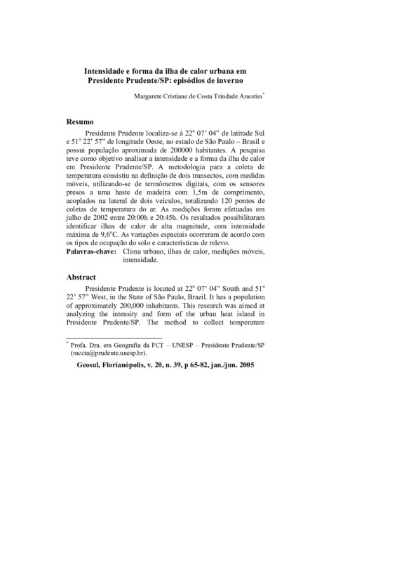 Presidente Prudente localiza-se à 22o 07’ 04” de latitude Sul e 51o 22’ 57” de longitude Oeste, no estado de São Paulo – Brasil e possui população aproximada de 200000 habitantes. A pesquisa teve como objetivo analisar a intensidade e a forma da ilha de calor em Presidente Prudente/SP. A metodologia para a coleta de temperatura consistiu na definição de dois transectos, com medidas móveis, utilizando-se de termômetros digitais, com os sensores presos a uma haste de madeira com 1,5m de comprimento, acoplados na lateral de dois veículos, totalizando 120 pontos de coletas de temperatura do ar. As medições foram efetuadas em julho de 2002 entre 20:00h e 20:45h. Os resultados possibilitaram identificar ilhas de calor de alta magnitude, com intensidade máxima de 9,6oC. As variações espaciais ocorreram de acordo com os tipos de ocupação do solo e características de relevo.