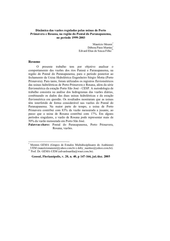 O presente trabalho tem por objetivo analisar o comportamento das vazões dos rios Paraná e Paranapanema, na região do Pontal do Paranapanema, para o período posterior ao fechamento da Usina Hidrelétrica Engenheiro Sérgio Motta (Porto Primavera). Para tanto, foram utilizados os registros fluviométricos das usinas hidrelétricas de Porto Primavera e Rosana, além da série fluviométrica da estação Porto São José - CESP. A metodologia de trabalho consistiu na análise dos hidrogramas das vazões diárias, combinando os dados das duas usinas hidrelétricas e da estação fluviométrica em questão. Os resultados mostraram que as usinas têm interferido de forma considerável nas vazões do Pontal do Paranapanema. Na maior parte do tempo, a usina de Porto Primavera contribui com 83% da vazão mensurada a jusante, ao passo que a usina de Rosana contribui com 17%. Em alguns períodos singulares, a vazão de Rosana pode representar mais de 50% da vazão mensurada em Porto São José.