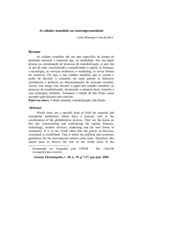 As cidades mundiais são um tipo específico de campo de produção material e imaterial que, na atualidade, têm um papel primaz na coordenação do processo de mundialização, já que são os nós de rede, concentrando e centralizando o capital, as finanças, a tecnologia, os serviços modernos, o marketing, as novas formas do comércio. Ou seja, é nas cidades mundiais que se instala o poder de decisão, o comando, de onde partem as diretrizes econômicas e políticas no direcionamento do mercado mundial. Assim, este artigo visa discutir o papel das cidades mundiais no processo de mundialização, destacando a natureza deste conceito e seus principais atributos. Tomamos a cidade de São Paulo como exemplo para discutir este conceito.