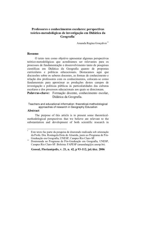 Professores e conhecimentos escolares: perspectivas teórico-metodológicas de investigação em Didática da Geografia