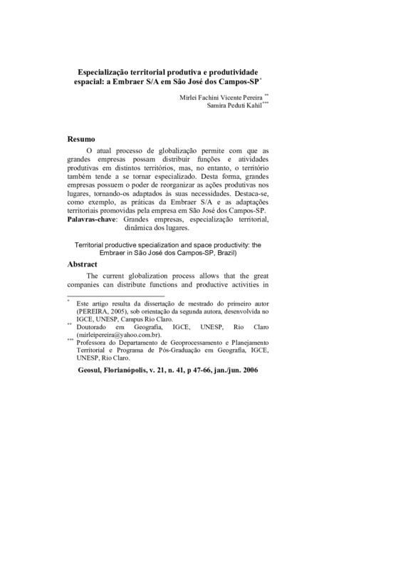 Especialização territorial produtiva e produtividade espacial: a Embraer S/A em São José dos Campos-SP