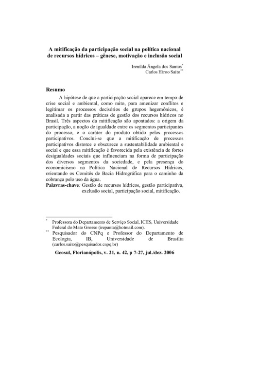 A hipótese de que a participação social aparece em tempo de crise social e ambiental, como mito, para amenizar conflitos e legitimar os processos decisórios de grupos hegemônicos, é analisada a partir das práticas de gestão dos recursos hídricos no Brasil. Três aspectos da mitificação são apontados: a origem da participação, a noção de igualdade entre os segmentos participantes do processo, e o caráter do produto obtido pelos processos participativos. Conclui-se que a mitificação de processos participativos distorce e obscurece a sustentabilidade ambiental e social e que essa mitificação é favorecida pela existência de fortes desigualdades sociais que influenciam na forma de participação dos diversos segmentos da sociedade, e pela presença do economicismo na Política Nacional de Recursos Hídricos, orientando os Comitês de Bacia Hidrográfica para o caminho da cobrança pelo uso da água.