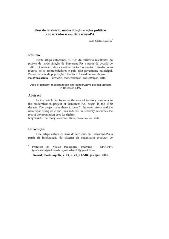 http://dx.doi.org/10.5007/2177-5230.2008v23n45p65Neste artigo enfocamos os usos do território resultantes do projeto de modernização de Barcarena-PA a partir da década de 1980. O corolário desta modernização é o território usado como recurso pelos empreendedores e pela elite governante municipal. Para o restante da população o território é usado como abrigo