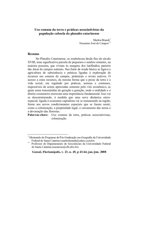 Uso comum da terra e práticas associativistas da população cabocla do planalto catarinense