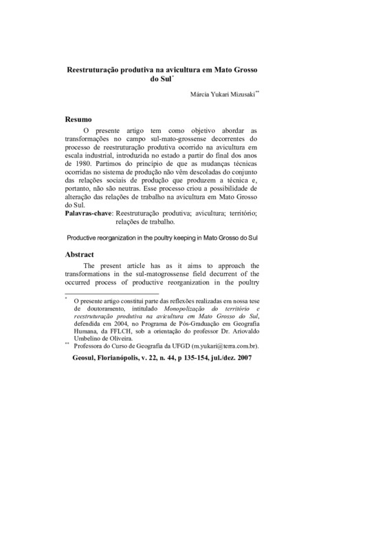 O presente artigo tem como objetivo abordar as transformações no campo sul-mato-grossense decorrentes do processo de reestruturação produtiva ocorrido na avicultura em escala industrial, introduzida no estado a partir do final dos anos de 1980. Partimos do princípio de que as mudanças técnicas ocorridas no sistema de produção não vêm descoladas do conjunto das relações sociais de produção que produzem a técnica e, portanto, não são neutras. Esse processo criou a possibilidade de alteração das relações de trabalho na avicultura em Mato Grosso do Sul.