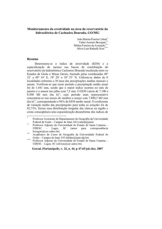 Monitoramento da erosividade na área do reservatório da hidroelétrica de Cachoeira Dourada, GO/MG