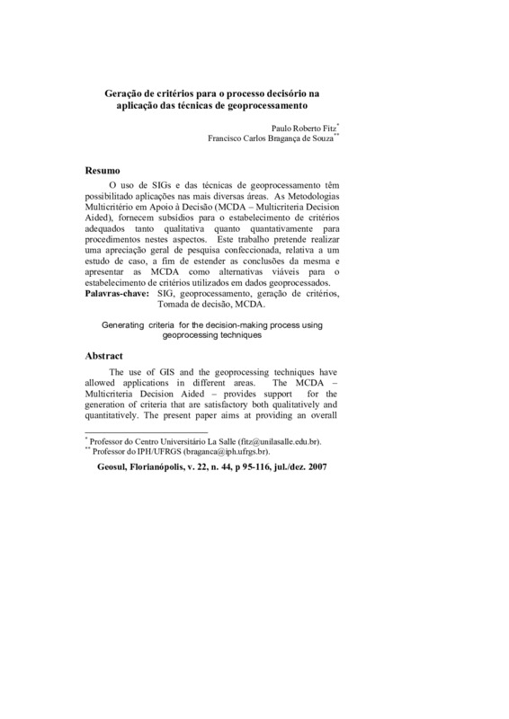 O uso de SIGs e das técnicas de geoprocessamento têm possibilitado aplicações nas mais diversas áreas. As Metodologias Multicritério em Apoio à Decisão (MCDA – Multicriteria Decision Aided), fornecem subsídios para o estabelecimento de critérios adequados tanto qualitativa quanto quantativamente para procedimentos nestes aspectos. Este trabalho pretende realizar uma apreciação geral de pesquisa confeccionada, relativa a um estudo de caso, a fim de estender as conclusões da mesma e apresentar as MCDA como alternativas viáveis para o estabelecimento de critérios utilizados em dados geoprocessados.