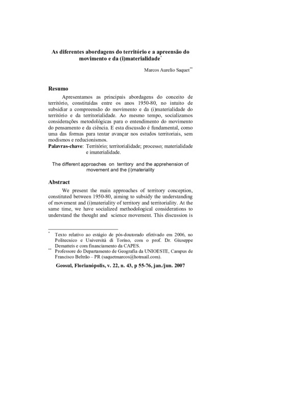 Apresentamos as principais abordagens do conceito de território, constituídas entre os anos 1950-80, no intuito de subsidiar a compreensão do movimento e da (i)materialidade do território e da territorialidade. Ao mesmo tempo, socializamos considerações metodológicas para o entendimento do movimento do pensamento e da ciência. E esta discussão é fundamental, como uma das formas para tentar avançar nos estudos territoriais, sem modismos e reducionismos.