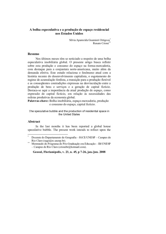 http://dx.doi.org/10.5007/2177-5230.2008v23n45p7Nos últimos meses têm se noticiado a respeito de uma bolha especulativa imobiliária global. O presente artigo busca refletir sobre esta produção e consumo do espaço na forma-mercadoria, com destaque para a conjuntura norte-americana, muito além da demanda efetiva. Este estudo relaciona o fenômeno atual com a história recente do desenvolvimento capitalista, o esgotamento do regime de acumulação fordista, a transição para a produção flexível e as conseqüentes contradições expressas na desvinculação entre a produção de bens e serviços e a geração de capital fictício. Destaca-se aqui a importância da atual produção de espaço, como expressão de capital fictício, em relação às necessidades das esferas produtivas da economia global.