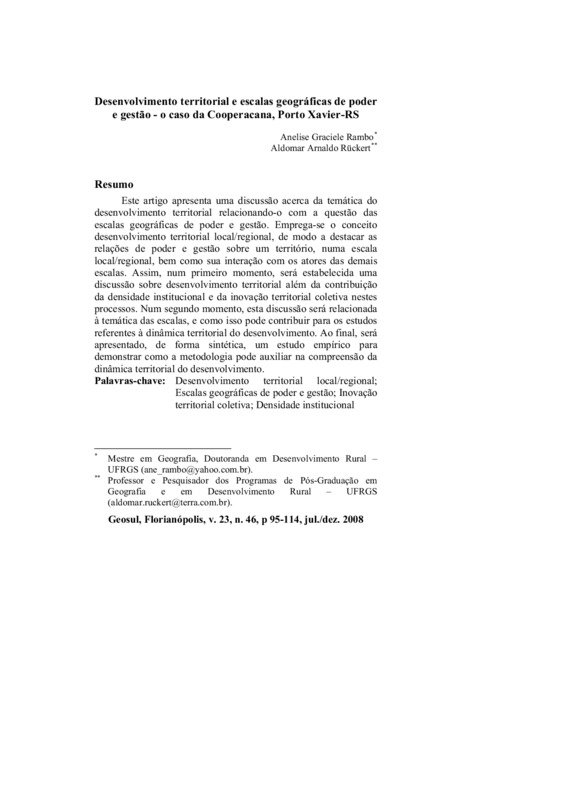 http://dx.doi.org/10.5007/2177-5230.2008v23n46p96Este artigo apresenta uma discussão acerca da temática do desenvolvimento territorial relacionando-o com a questão das escalas geográficas de poder e gestão. Emprega-se o conceito desenvolvimento territorial local/regional, de modo a destacar as relações de poder e gestão sobre um território, numa escala local/regional, bem como sua interação com os atores das demais escalas. Assim, num primeiro momento, será estabelecida uma discussão sobre desenvolvimento territorial além da contribuição da densidade institucional e da inovação territorial coletiva nestes processos. Num segundo momento, esta discussão será relacionada à temática das escalas, e como isso pode contribuir para os estudos referentes à dinâmica territorial do desenvolvimento. Ao final, será apresentado, de forma sintética, um estudo empírico para demonstrar como a metodologia pode auxiliar na compreensão da dinâmica territorial do desenvolvimento.