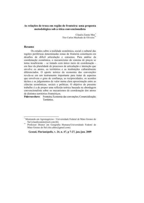 http://dx.doi.org/10.5007/2177-5230.2009v24n47p7Os estudos sobre a realidade econômica, social e cultural das regiões periféricas denominadas zonas de fronteira constituem em desafios de difícil articulação e consenso. Para análise da coordenação econômica, o mecanicismo do sistema de preços se torna insuficiente – se tratado com único meio de coordenação - em face da pluralidade de processos de articulação e interação que envolve os atores, os territórios e as instituições culturalmente diferenciados. O aporte teórico da economia das convenções revela-se em um instrumento importante para tratar de aspectos que envolvem o grau de confiança, as reciprocidades, os acordos tácitos e os julgamentos de valor numa clara aproximação entre as ciências econômicas, sociais e políticas. O objetivo do presente trabalho é a de propor uma reflexão teórica baseada na bordagem convencionalista sobre os mecanismos de coordenação dos atores de distintos territórios fronteiriços.