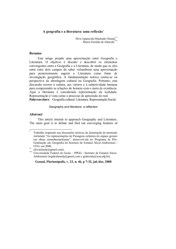 http://dx.doi.org/10.5007/2177-5230.2008v23n46p7Este artigo propõe uma aproximação entre Geografia e Literatura. O objetivo é discutir e descobrir os elementos convergentes entre a Geografia e a Literatura, de modo que os elos entre estes dois campos do saber vislumbrem uma aproximação para posteriormente sugerir a Literatura como fonte de investigação geográfica. A fundamentação teórica centra-se na perspectiva da abordagem cultural na Geografia. Portanto, esta discussão recorre à cultura, aos valores e à subjetividade humana para compreender as relações do homem com o meio de existência. Aqui a literatura é considerada representação da realidade. Representação é vista como o processo de apreensão do real. Palavras-chave: Geografia cultural. Literatura. Representação Social.