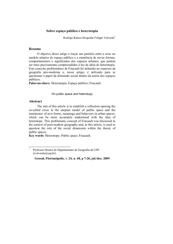 http://dx.doi.org/10.5007/2177-5230.2009v24n48p7O objetivo desse artigo é traçar um paralelo entre a crise nomodelo utópico de espaço público e a eminência de novas formas,comportamentos e significados dos espaços urbanos, que podemser mais precisamente compreendidos à luz da idéia de heterotopia.Este conceito problemático de Foucault foi debatido no contexto dageografia pós-moderna e, nesse artigo, é utilizado para sequestionar o papel da dimensão social dentro da teoria dos espaçospúblicos.