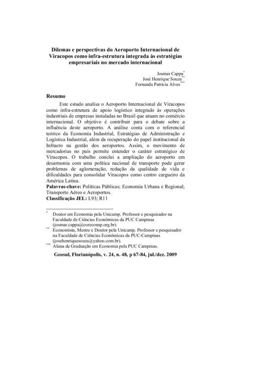 http://dx.doi.org/10.5007/2177-5230.2009v24n48p67Este estudo analisa o Aeroporto Internacional de Viracopos como infra-estrutura de apoio logístico integrado às operações industriais de empresas instaladas no Brasil que atuam no comércio internacional. O objetivo é contribuir para o debate sobre a influência deste aeroporto. A análise conta com o referencial teórico da Economia Industrial, Estratégias de Administração e Logística Industrial, além da recuperação do papel institucional da Infraero na gestão dos aeroportos. Assim, o movimento de mercadorias no país permite entender o caráter estratégico de Viracopos. O trabalho conclui a ampliação do aeroporto em desarmonia com uma política nacional de transporte pode gerar problemas de aglomeração, redução da qualidade de vida e dificuldades para consolidar Viracopos como centro cargueiro da América Latina.