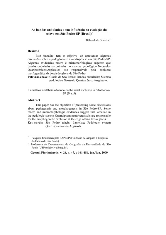 http://dx.doi.org/10.5007/2177-5230.2009v24n47p161Este trabalho tem o objetivo de apresentar algumas discussões sobre a pedogênese e a morfogênese em São Pedro-SP. Algumas evidências macro e micromorfológicas sugerem que bandas onduladas encontradas no sistema pedológico Neossolos Quartzarênicos/Argissolos são responsáveis pela evolução morfogenética da borda do glacis de São Pedro.