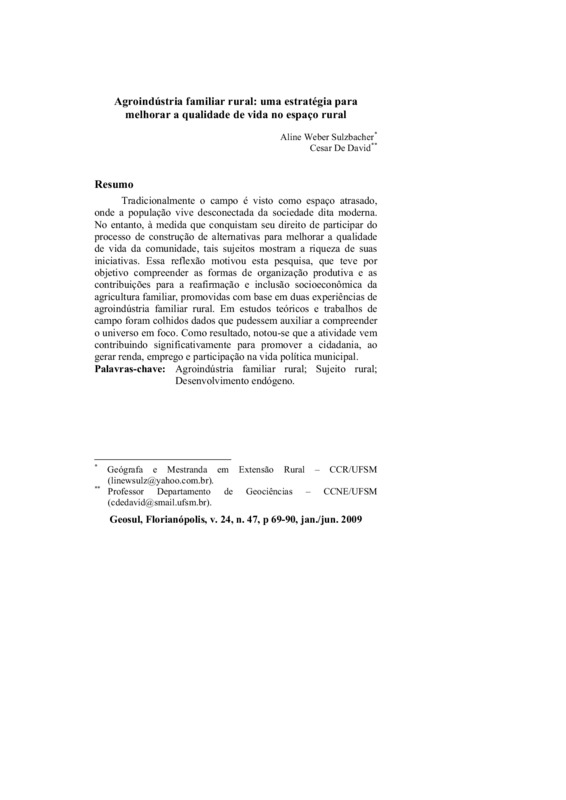 http://dx.doi.org/10.5007/2177-5230.2009v24n47p69Tradicionalmente o campo é visto como espaço atrasado, onde a população vive desconectada da sociedade dita moderna. No entanto, à medida que conquistam seu direito de participar do processo de construção de alternativas para melhorar a qualidade de vida da comunidade, tais sujeitos mostram a riqueza de suas iniciativas. Essa reflexão motivou esta pesquisa, que teve por objetivo compreender as formas de organização produtiva e as contribuições para a reafirmação e inclusão socioeconômica da agricultura familiar, promovidas com base em duas experiências de agroindústria familiar rural. Em estudos teóricos e trabalhos de campo foram colhidos dados que pudessem auxiliar a compreender o universo em foco. Como resultado, notou-se que a atividade vem contribuindo significativamente para promover a cidadania, ao gerar renda, emprego e participação na vida política municipal.