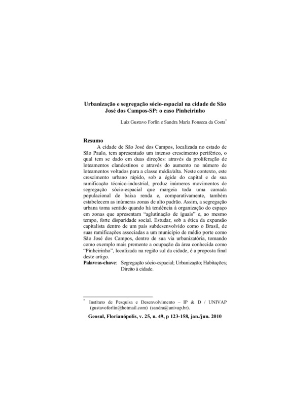 Urbanização e segregação sócio-espacial na cidade de São José dos Campos-SP: o caso Pinheirinho doi: 10.5007/2177-5230.2010v25n49p123