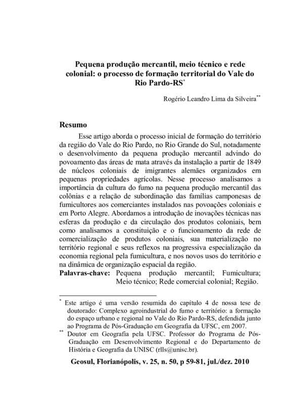 http://dx.doi.org/10.5007/2177-5230.2010v26n50p59Esse artigo aborda o processo inicial de formação do território da região do Vale do Rio Pardo, no Rio Grande do Sul, notadamente o desenvolvimento da pequena produção mercantil advindo do povoamento das áreas de mata através da instalação a partir de 1849 de núcleos coloniais de imigrantes alemães organizados em pequenas propriedades agrícolas. Nesse processo analisamos a importância da cultura do fumo na pequena produção mercantil das colônias e a relação de subordinação das famílias camponesas de fumicultores aos comerciantes instalados nas povoações coloniais e em Porto Alegre. Abordamos a introdução de inovações técnicas nas esferas da produção e da circulação dos produtos coloniais, bem como analisamos a constituição e o funcionamento da rede de comercialização de produtos coloniais, sua materialização no território regional e seus reflexos na progressiva especialização da economia regional pela fumicultura, e nos novos usos do território e na dinâmica de organização espacial da região.