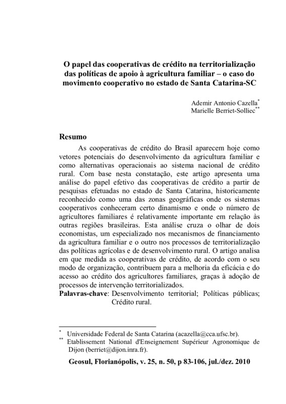 O papel das cooperativas de crédito na territorialização das políticas de apoio à agricultura familiar – o caso do movimento cooperativo no estado de Santa Catarina-SC