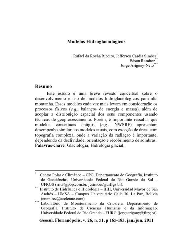 http://dx.doi.org/10.5007/2177-5230.2011v26n51p165Este estudo é uma breve revisão conceitual sobre o desenvolvimento e uso de modelos hidroglaciológicos para alta montanha. Esses modelos cada vez mais levam em consideração os processos físicos (e.g., balanços de energia e massa), além de acoplar a distribuição espacial dos seus componentes usando técnicas de geoprocessamento. Porém, é importante ressaltar que modelos conceituais antigos (e.g., NWSRF) apresentam desempenho similar aos modelos atuais, com exceção de áreas com topografia complexa, onde a variação da radiação é importante, dependendo da declividade, orientação e recobrimento de sombras.