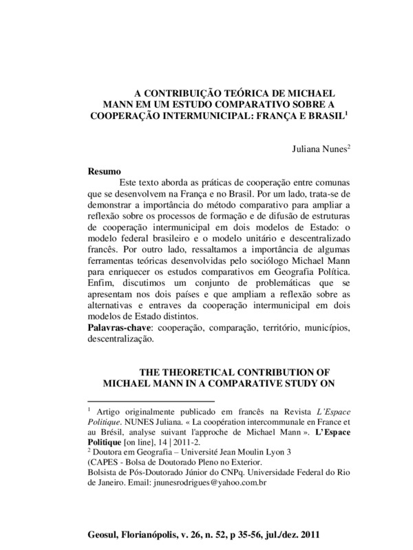 A contribuição teórica de Michael Mann em um estudo comparativo sobre a cooperação intermunicipal: França e Brasil