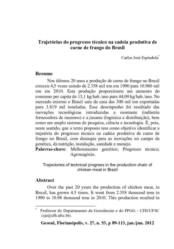 http://dx.doi.org/10.5007/2177-5230.2012v27n53p89Nos últimos 20 anos a produção de carne de frango no Brasil cresceu 4,5 vezes saindo de 2.358 mil ton em 1990 para 10.980 mil ton em 2010. Esta produção proporcionou um aumento do consumo per capita de 13,1 kg/hab./ano para 44,09 kg/hab./ano. No mercado externo o Brasil saiu da casa das 300 mil ton exportadas para 3.819 mil toneladas. Esse desempenho foi resultado das inovações tecnológicas introduzidas a montante (indústria fornecedora de insumos) e a jusante (logística e distribuição), bem como um amplo sistema de pesquisa, ciência e tecnologia. É, pois, neste sentido, que o texto proposto tem como objetivo identificar a trajetória do progresso técnico na cadeia produtiva de carne de frango no Brasil, com destaque para as inovações no campo da genética, da nutrição, instalação, sanidade e manejo.Palavras-chave: Melhoramento genético; Progresso técnico; Agronegócio.
