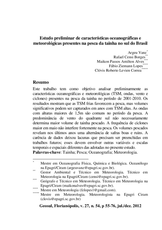 http://dx.doi.org/10.5007/2177-5230.2012v27n54p55Este trabalho tem como objetivo analisar preliminarmente as características oceanográficas e meteorológicas (TSM, ondas, vento e ciclones) presentes na pesca da tainha no período de 2001-2010. Os resultados mostram que as TSM frias favorecem a pesca, mas volumes significativos podem ser capturados em anos com TSM altas. As ondas com alturas maiores de 1,5m são comuns no período da pesca. A predominância de vento do quadrante sul não necessariamente determina maior volume de tainha pescado. A frequência de ciclones maior em maio não interfere fortemente na pesca. Os volumes pescados revelam nos últimos anos uma alternância de safras boas e ruins. A carência de dados deixou lacunas que precisam ser preenchidas em trabalhos futuros; esses devem envolver outras variáveis e escalas temporais e espaciais diferentes das adotadas no presente estudo