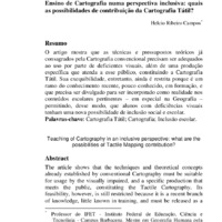 ENSINO DE CARTOGRAFIA NUMA PERSPECTIVA INCLUSIVA: QUAIS AS POSSIBILIDADES DE CONTRIBUIÇÃO DA CARTOGRAFIA TÁTIL?http://dx.doi.org/10.5007/2177-5230.2012v27n54p165O artigo mostra que as técnicas e pressupostos teóricos já consagrados pela Cartografia convencional precisam ser adequados ao uso por parte de deficientes visuais, além de uma produção específica que atenda a esse público, constituindo a Cartografia Tátil. Sua exequibilidade, entretanto, ainda é restrita porque é um ramo do conhecimento recente, pouco conhecido, em formação, e que precisa ser divulgado para ser incorporado como realidade nos conteúdos escolares pertinentes – em especial na Geografia – permitindo, desse modo, que alunos com deficiências visuais tenham uma nova possibilidade de inclusão social e escolar.
