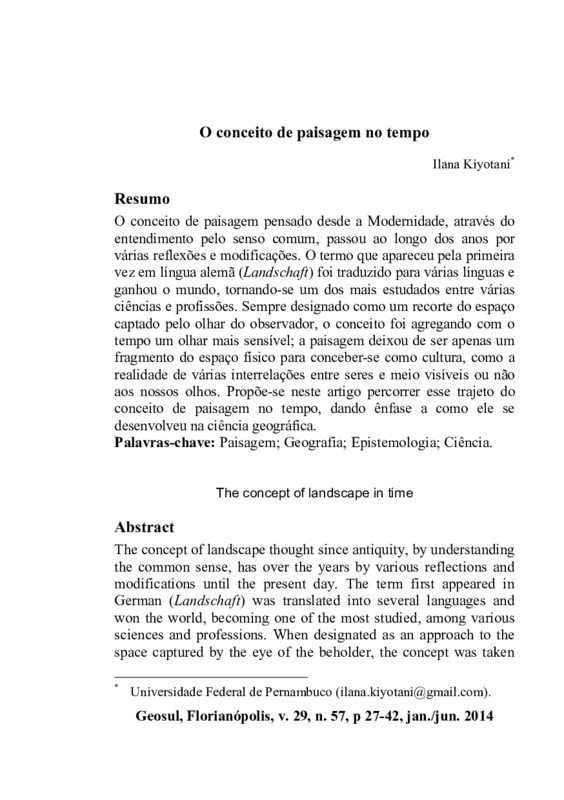 http://dx.doi.org/10.5007/2177-5230.2014v29n57p27O conceito de paisagem pensado desde a Modernidade, através do entendimento pelo senso comum, passou ao longo dos anos por várias reflexões e modificações. O termo que apareceu pela primeira vez em língua alemã (Landschaft) foi traduzido para várias línguas e ganhou o mundo, tornando-se um dos mais estudados entre várias ciências e profissões. Sempre designado como um recorte do espaço captado pelo olhar do observador, o conceito foi agregando com o tempo um olhar mais sensível; a paisagem deixou de ser apenas um fragmento do espaço físico para conceber-se como cultura, como a realidade de várias interrelações entre seres e meio visíveis ou não aos nossos olhos. Propõe-se neste artigo percorrer esse trajeto do conceito de paisagem no tempo, dando ênfase a como ele se desenvolveu na ciência geográfica