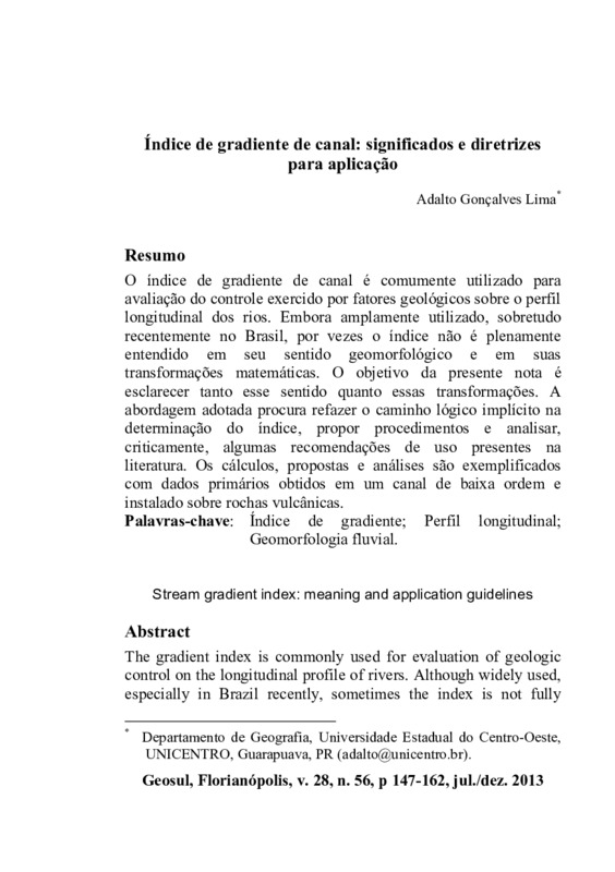http://dx.doi.org/10.5007/2177-5230.2013v28n56p147O índice de gradiente de canal é comumente utilizado para avaliação do controle exercido por fatores geológicos sobre o perfil longitudinal dos rios. Embora amplamente utilizado, sobretudo recentemente no Brasil, por vezes o índice não é plenamente entendido em seu sentido geomorfológico e em suas transformações matemáticas. O objetivo da presente nota é esclarecer tanto esse sentido quanto essas transformações. A abordagem adotada procura refazer o caminho lógico implícito na determinação do índice, propor procedimentos e analisar, criticamente, algumas recomendações de uso presentes na literatura. Os cálculos, propostas e análises são exemplificados com dados primários obtidos em um canal de baixa ordem e instalado sobre rochas vulcânicas.