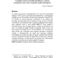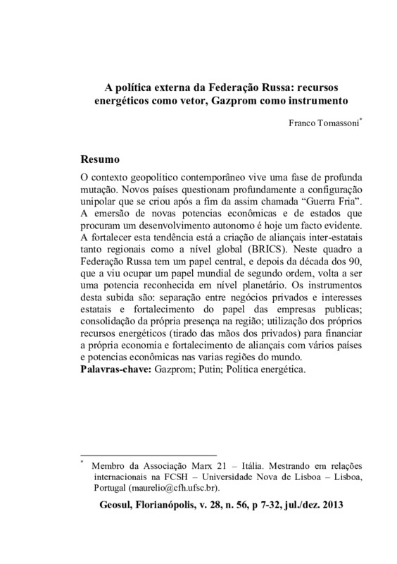 http://dx.doi.org/10.5007/2177-5230.2013v28n56p7O contexto geopolítico contemporâneo vive uma fase de profunda mutação. Novos países questionam profundamente a configuração unipolar que se criou após a fim da assim chamada “Guerra Fria”. A emersão de novas potencias econômicas e de estados que procuram um desenvolvimento autonomo é hoje um facto evidente. A fortalecer esta tendência está a criação de aliançais inter-estatais tanto regionais como a nível global (BRICS). Neste quadro a Federação Russa tem um papel central, e depois da década dos 90, que a viu ocupar um papel mundial de segundo ordem, volta a ser uma potencia reconhecida em nível planetário. Os instrumentos desta subida são: separação entre negócios privados e interesses estatais e fortalecimento do papel das empresas publicas; consolidação da própria presença na região; utilização dos próprios recursos energéticos (tirado das mãos dos privados) para financiar a própria economia e fortalecimento de aliançais com vários países e potencias econômicas nas varias regiões do mundo
